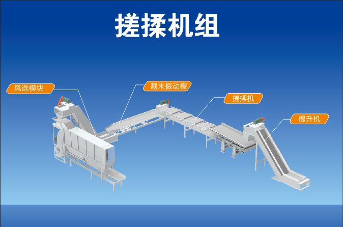 機組組成:本機組由提升機、搓揉機、割末振動槽、風選機、機組集成控制系統組成。